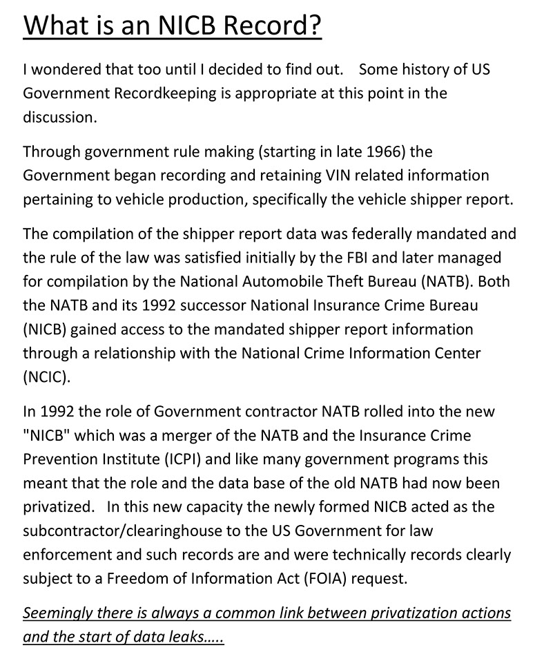 In 1992 the role of Government contractor NATB rolled into the new "NICB" which was a merger of the NATB and the Insurance Crime Prevention Institute (ICPI) and like many government programs this meant that the role and the data base of the old NATB had now been privatized. In this new capacity the newly formed NICB acted as the subcontractor/clearinghouse to the US Government for law enforcement and such records are and were technically records clearly subject to a Freedom of Information Act (FOIA) request.