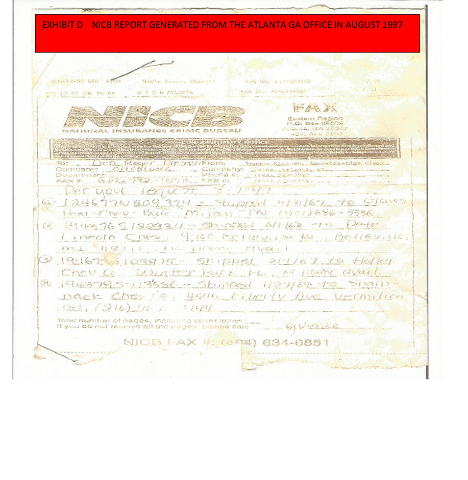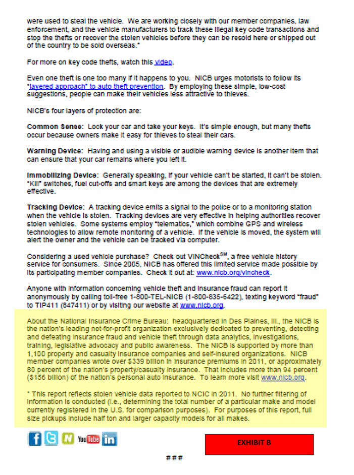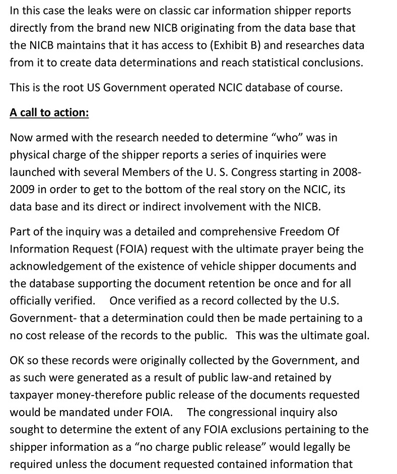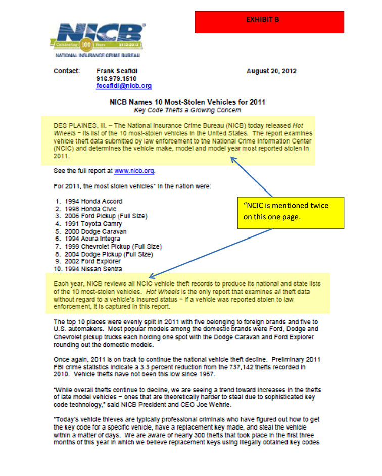 In this case the leaks were on classic car information shipper reports directly from the brand new NICB originating from the data base that the NICB maintains that it has access to (Exhibit B) and researches data from it to create data determinations and reach statistical conclusions.